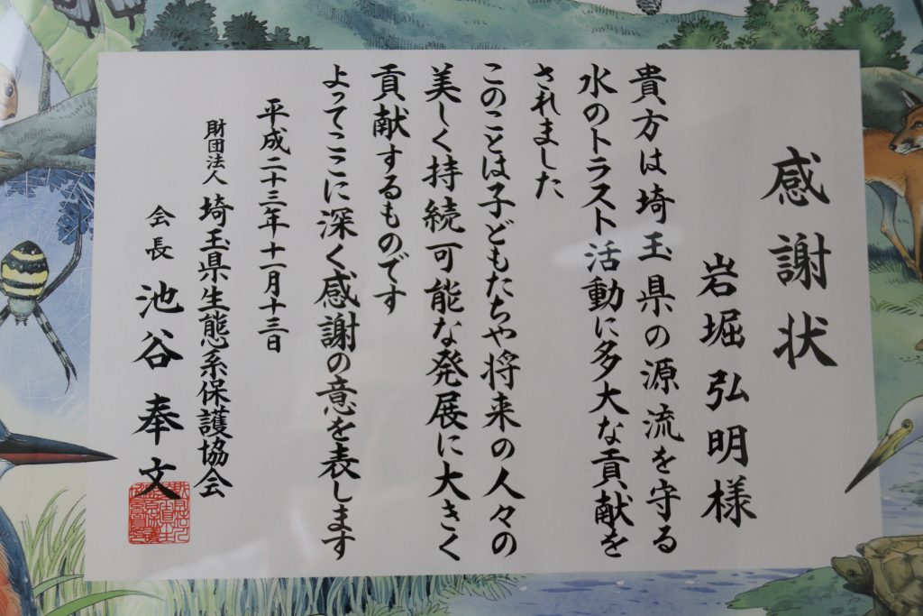 2011年、岩堀建設工業株式会社グルーブ全ての経営役員を退任した岩堀弘明は、青年会議所運動を経てライフワークとしてきた「美しき日本の自然を守る」活動を続け、以前より懇意にしていた公益財団法人埼玉県生態系保護協会の堂本専務理事(当時:事務局長)と懇談した。その時堂本氏から「荒川の水源地がビジネスを目的とした海外企業事業者に購入され、このままでは水源の森を守ることはできない」との衝撃的実態を聞くこととなり、「この森を守るのは自分しかいない」との高邁な使命感に突き動かされ、役員退任で得た金員を当協会に寄付。当協会は、その寄付金を基に「水のトラスト」第5号地として68ha(22万坪)の森(秩父市中津川狢沢)を取得。埼玉、群馬、長野の県境のこの土地は、荒川水系中津川の源流域、美しき滝「ムジナ沢」に面し、カツラ、サワグルミの大木がそびえたち、絶滅危惧種のクマタカなど多くの野生動物が生息している。